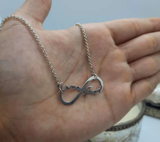 - Cadena con infinito + (2) nombres calados, realizada en plata 925 a mano por nuestros propios orfebres.