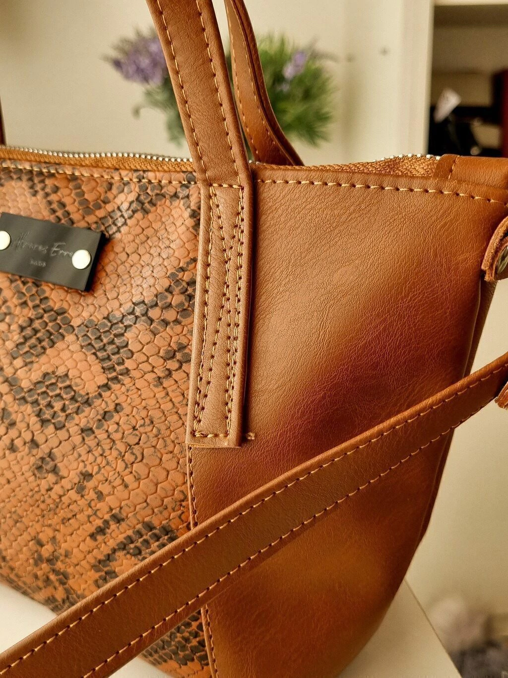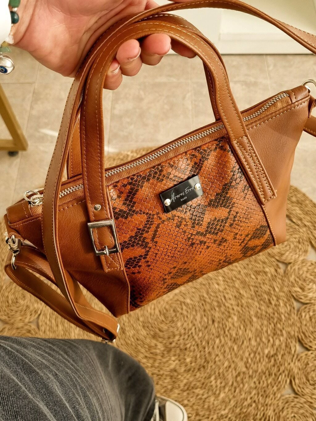 Confeccionado en cuero Pu suela y su centro es en reptil en la gama de los tierra. Sus asas son con detalle de hebilla color niquel, que le da un toque delicado. Posse tambien una correa regulable y desmontable.