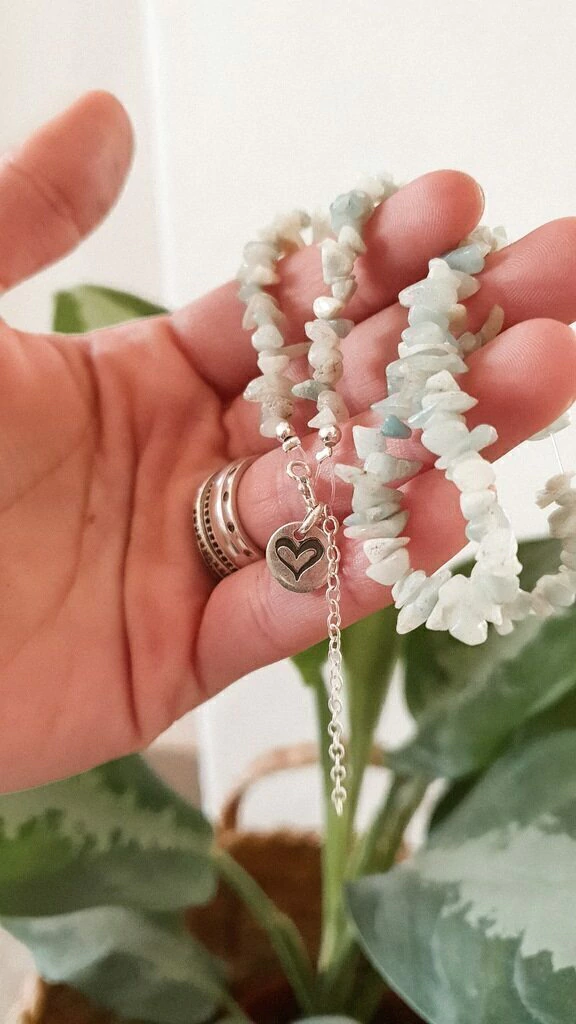 La aguamarina corresponde al 5º chakra, localizado en la zona de la garganta. Representa la alegría y la dulzura. Se asocia al equilibrio en la comunicación y la expresión en todos los niveles. Potencia la claridad mental, la paz interior, y la autoestima. A nivel curativo se dice que ayuda a calmar, desinflamar y descongestionar cualquier zona donde la pongamos. Suele ser de ayuda en dolencias físicas de la zona de la cabeza, como el dolor de oídos, de muelas, anginas e infecciones oculares.
